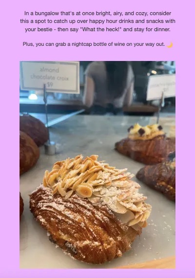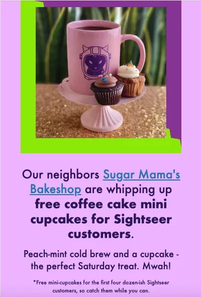 This later email announced and celebrated the coffee bar’s soft opening date. It reached ~600 customers’ inboxes directly, in contrast with organic social media posts that reached ~200-300 people (which was reasonable for un-boosted Meta posts, based on their number of followers).